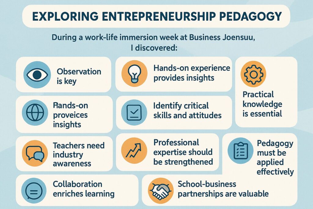 Viikossa parasta oli, kun pääsin seuraamaan, kuinka alkavat yrittäjät saivat henkilökohtaista sparrausta ja valmennusta – se on kuin siemen, joka kylvetään menestyksen maaperään. Henkilökohtaiset sparraukset yrittäjävalmentajien Heli Saario ja Lassi Immonen kanssa antoivat myös arvokasta näkökulmaa, kuinka yrittäjiä valmennetaan selkeästi käytäntöön alkuvaiheista alkaen. Helin innostavat ja herättelevät kysymykset saivat liikeideat kirkastumaan ja yrittäjät pohtivat tarkkaan kannattavuuden varmistamista. Lassin käytännön neuvot laskutuksesta, sopimuksista ja esimerkiksi verkkopankin käytöstä, sähköisestä laskutuksesta olivat oivaltavia ja helposti sovellettavissa omaan toimintaan. Nämä keskustelut muistuttivat, että yrittäjän arki on täynnä pieniä, mutta tärkeitä päätöksiä, jotka rakentavat menestyksen perustaa. Uuden toiminnan synnyttämisessä edetään ratkaisuhakuisesti, joustavasti ja opitaan sietämään epävarmuutta. Ja viides rastin yrittäjyyspedagogiikan ruutuun: yrittäjyys on yleisesti toiminnallista pedagogiikkaa.
